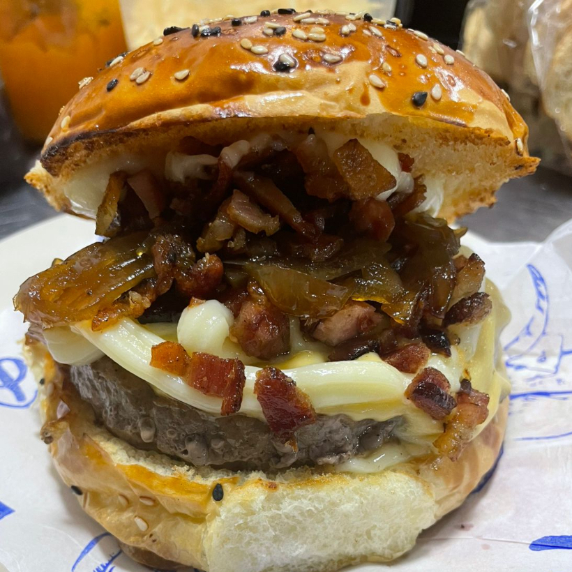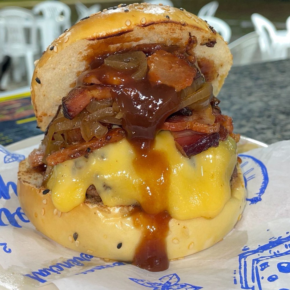 Carne 160g, pão de gergelim, queijo prato, farofa de bacon, cebola caramelizada, molho 4 queijos