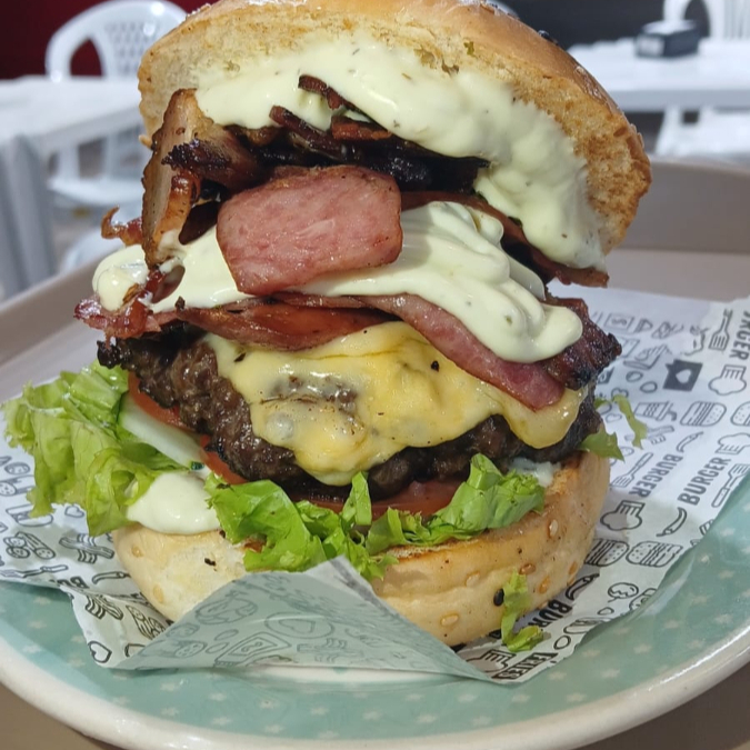 Pão de leite, carne 160g, queijo prato, bacon, calabresa, molho moda da casa e salada