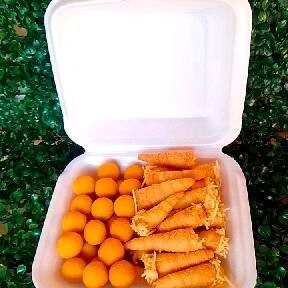 Meio cento sendo 25 canudinho patê de Frango + 25 mini bolinha de Queijo com + 1 refrigerante lata (350 ml)