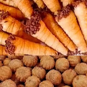 Meio cento (50 unidades)25 mini Churros de doce de leite+ 25 mini canudinho recheado com chocolate Massa tradicional de salgados