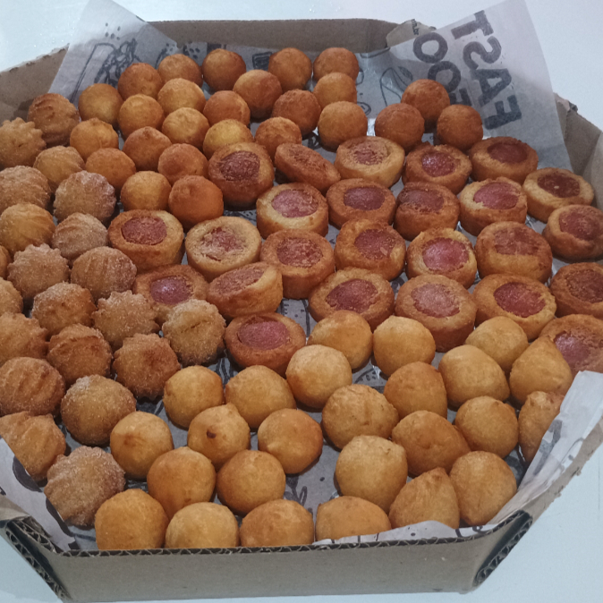 ( coxinha de frango, bolinha de queijo com presunto, salsicha e churros)