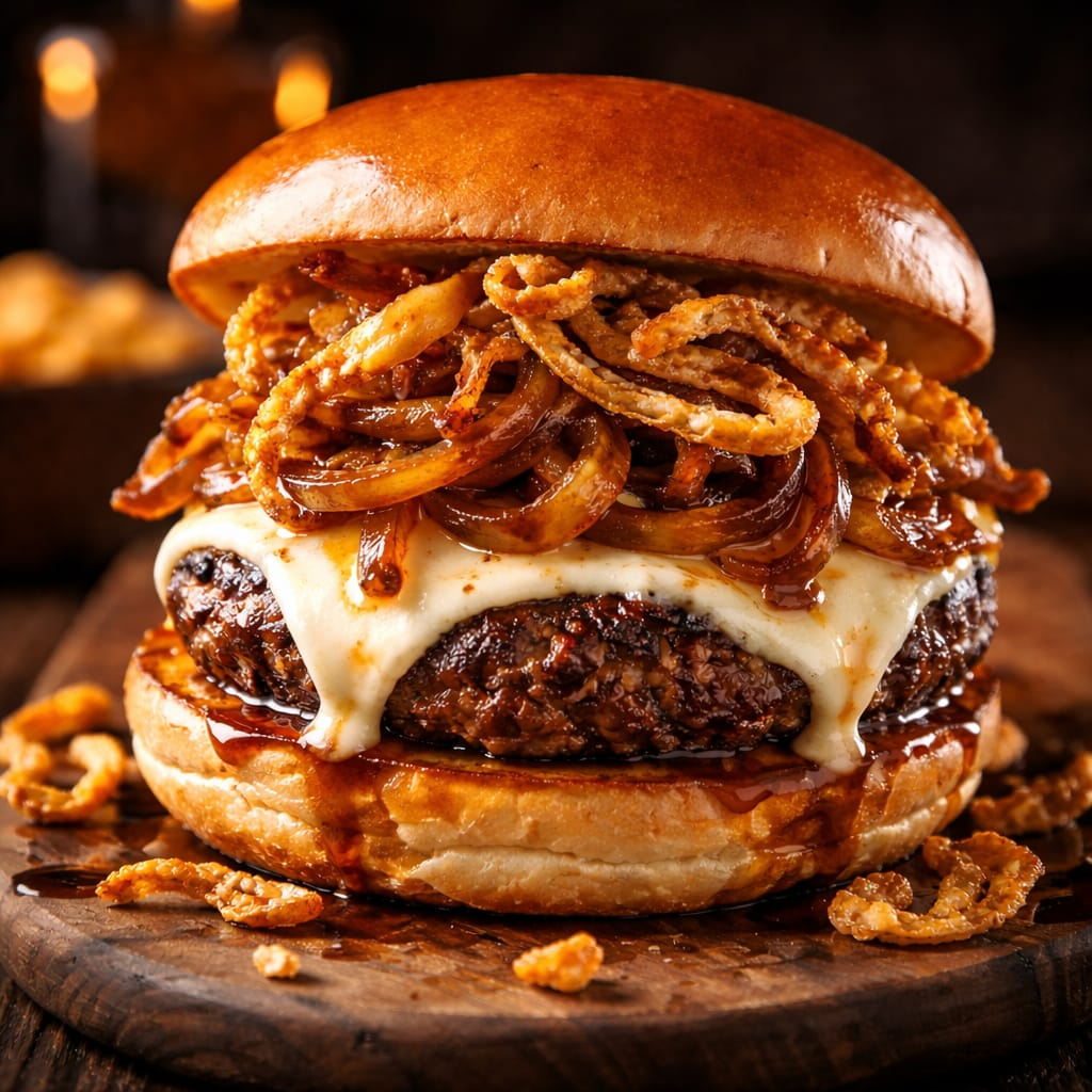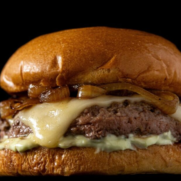 Pão, carne, queijo, cebola caramelizada e crysp de cebola.
