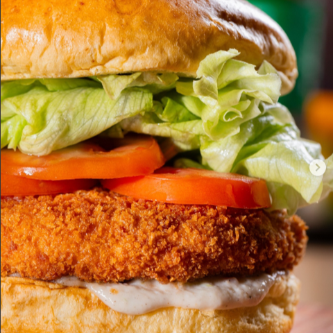 Pão, filé de frango empanado, creme cheddar, cebola caramelizada, salada (alface e tomate) e crysp de cebola.