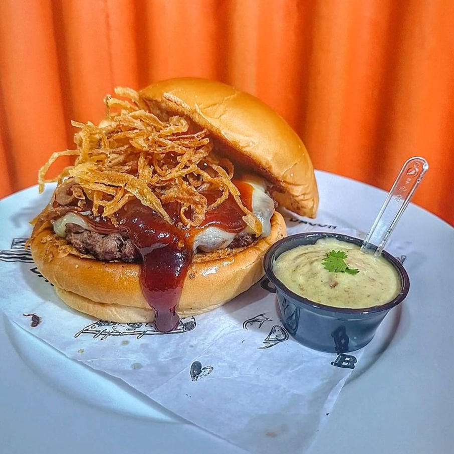 Pão, carne, queijo, geléia de goiabada c/ bbq e crysp de cebola.