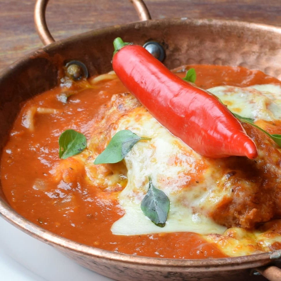 Delicioso Bife de Filé Mignon, Empanado na Farinha Japonesa, Coberto Com Molho Vermelho Caseiro, Gratinado Com Queijo, Servido Sobre Espaguete Ao Alho e Azeite.