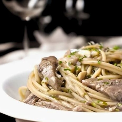 Espaguete com lâminas de alho ao molho branco com deliciosas tiras de filé mignon refogados no azeite e manjericão.