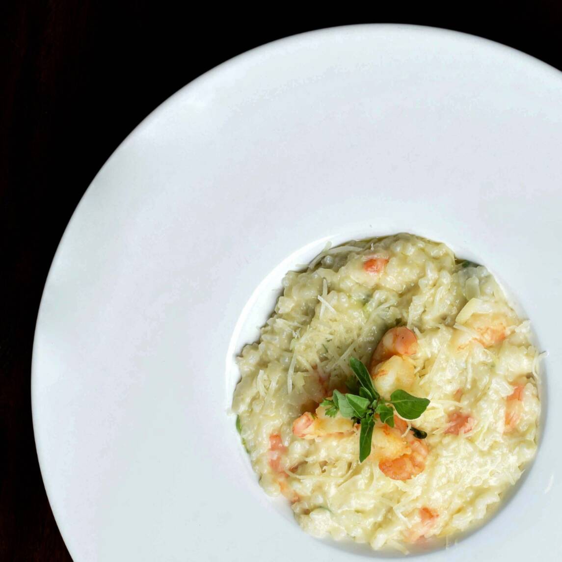 Camarões-rosa e camarões regionais flambados no vinho branco finalizados no arroz cremoso com caldo de legumes, parmesão.