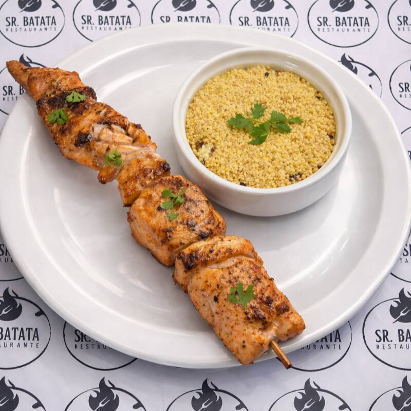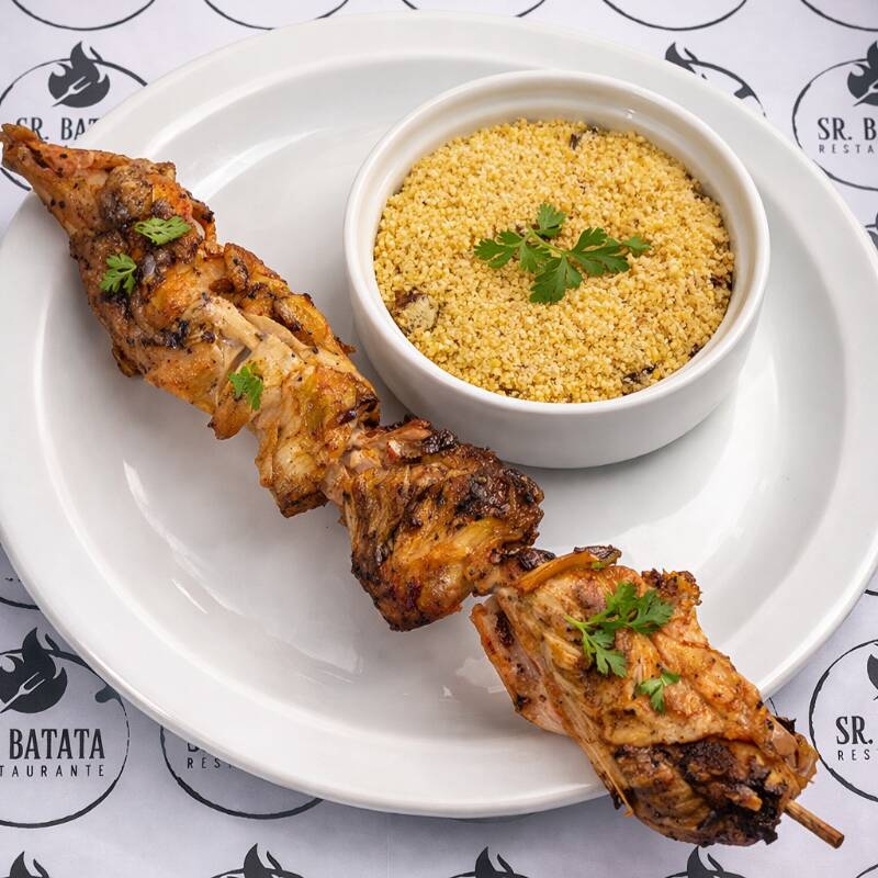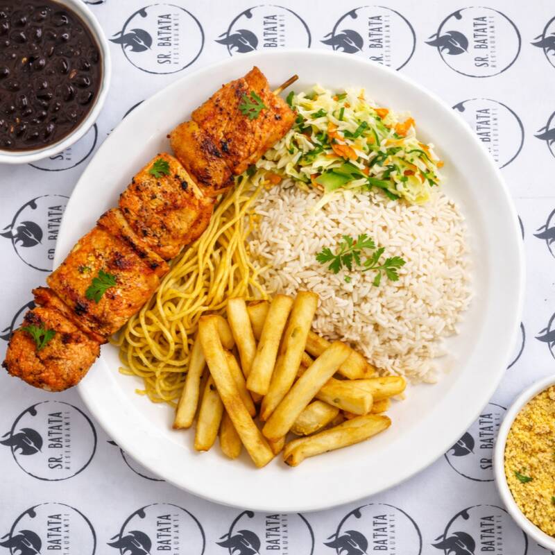 Frango – Espeto Completo (acompanhamentos: Arroz, Feijão, Macarrão, Salada Verde, Farofa ).