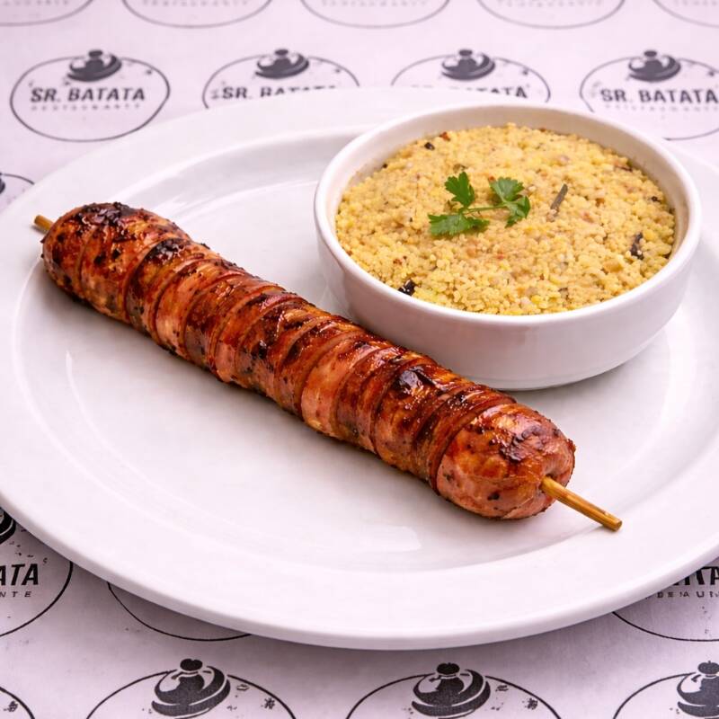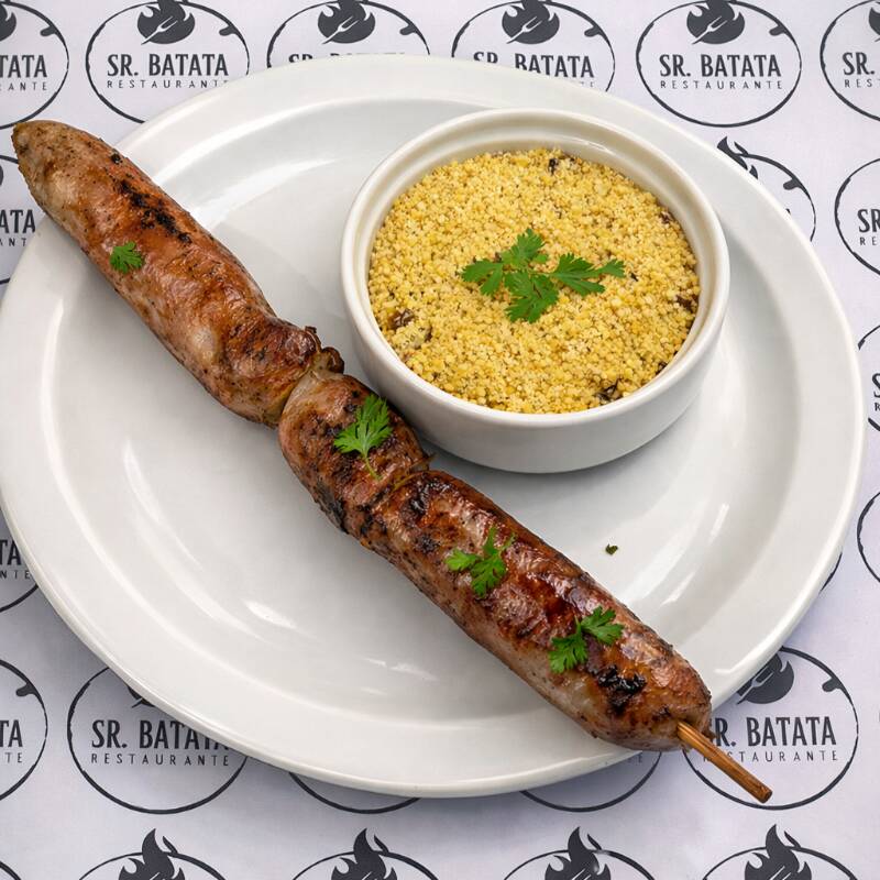 Calabresa – Espeto Completo (acompanhamentos: Arroz, Feijão, Macarrão, Salada Verde, Farofa).