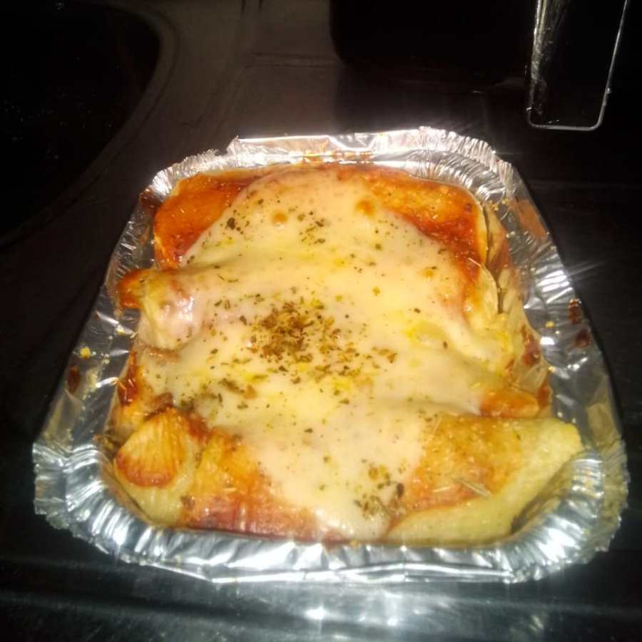 Panquecas de frango, molho e um queijo por cima, queijo ralado e orégano.