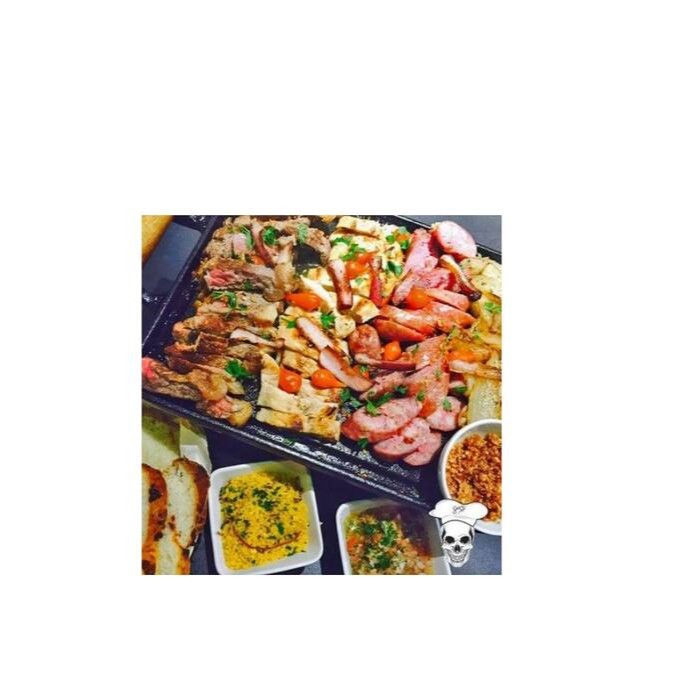 Seu prato terá 4 sabores preparados nachapa. (carne, frango, toscana de frango e calabresa) acompanhado de arroz, purê, salada, farofa e fritas.