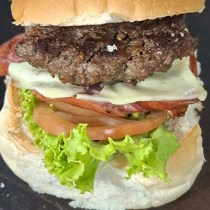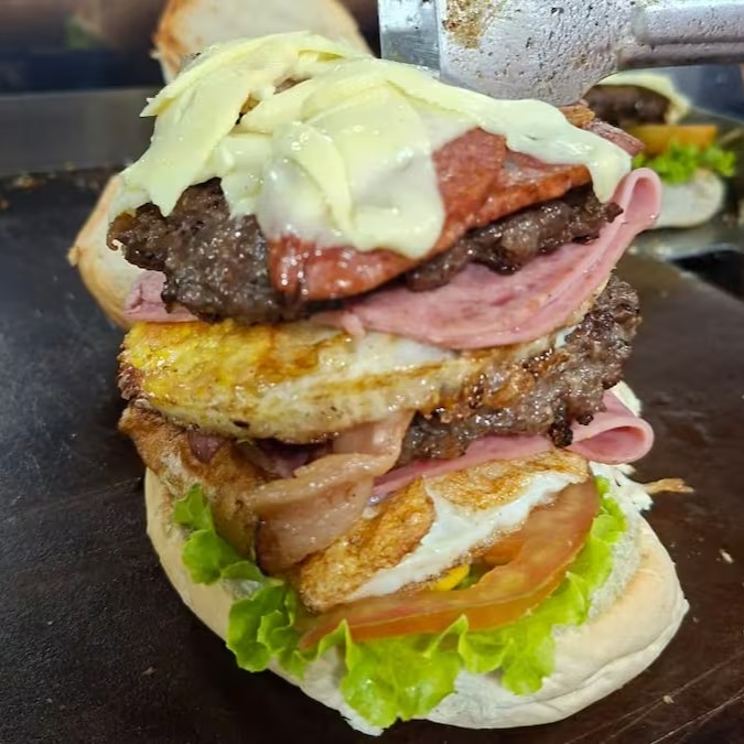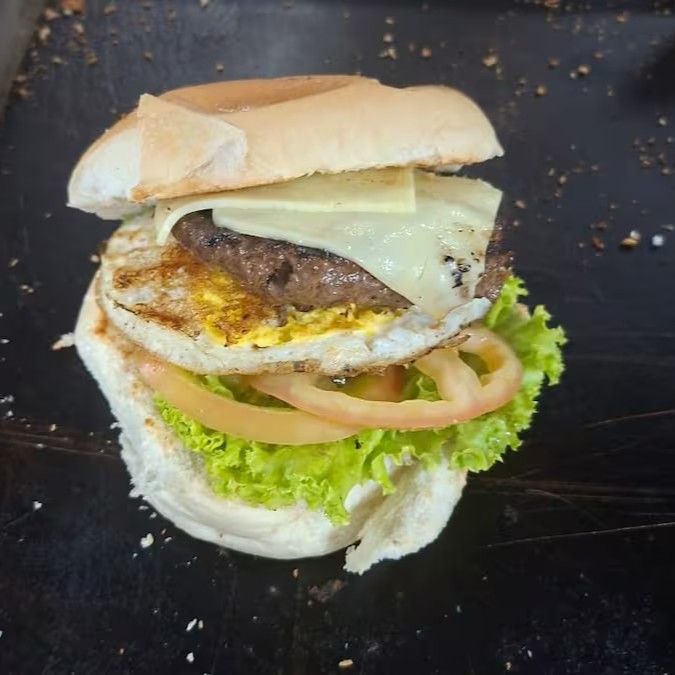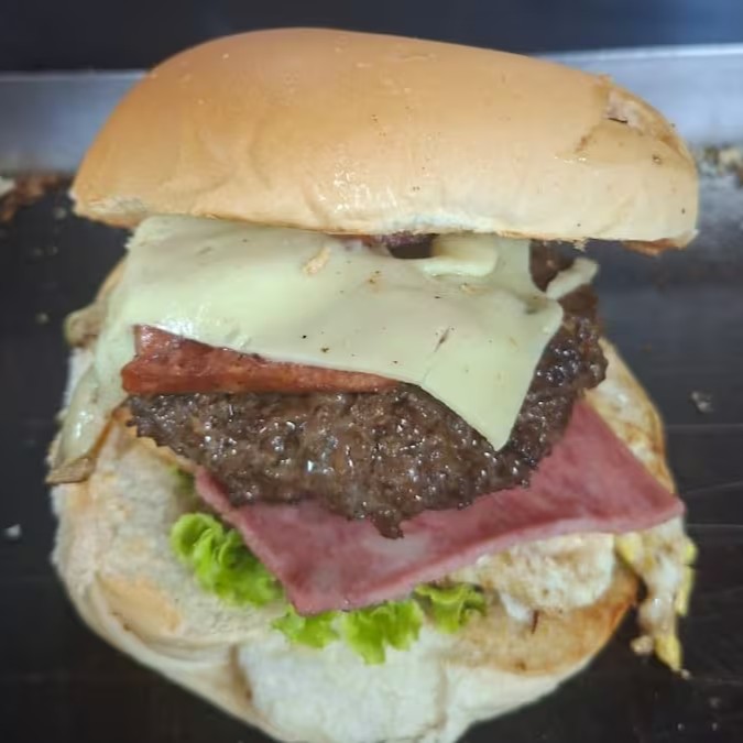 Pão bola, 2 carnes,2 presunto, 2 ovos,2 queijo, bacon ,calabresa, alface, tomate, milho, batata palha