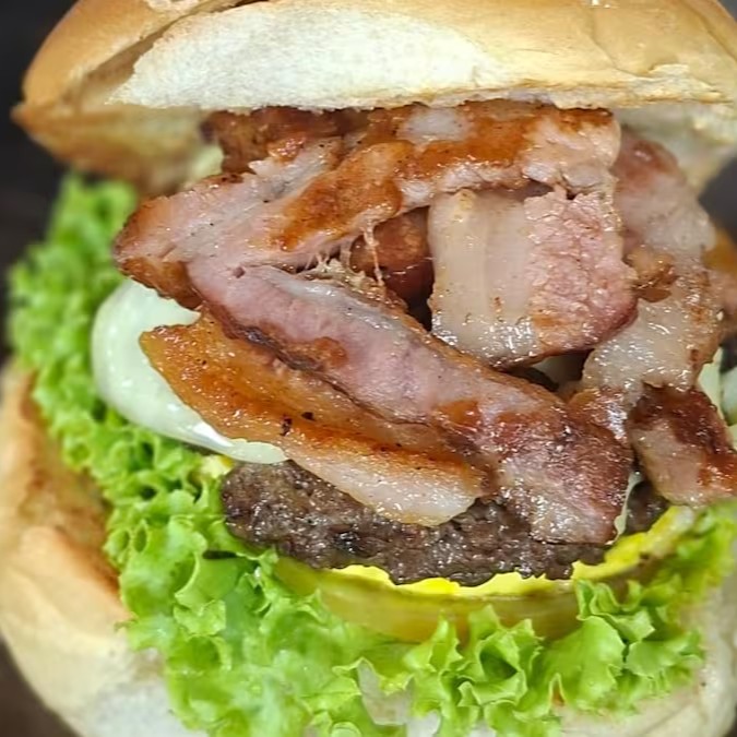Pão bola, carne ,bacon, queijo, alface, tomate, milho, batata palha.