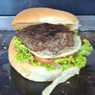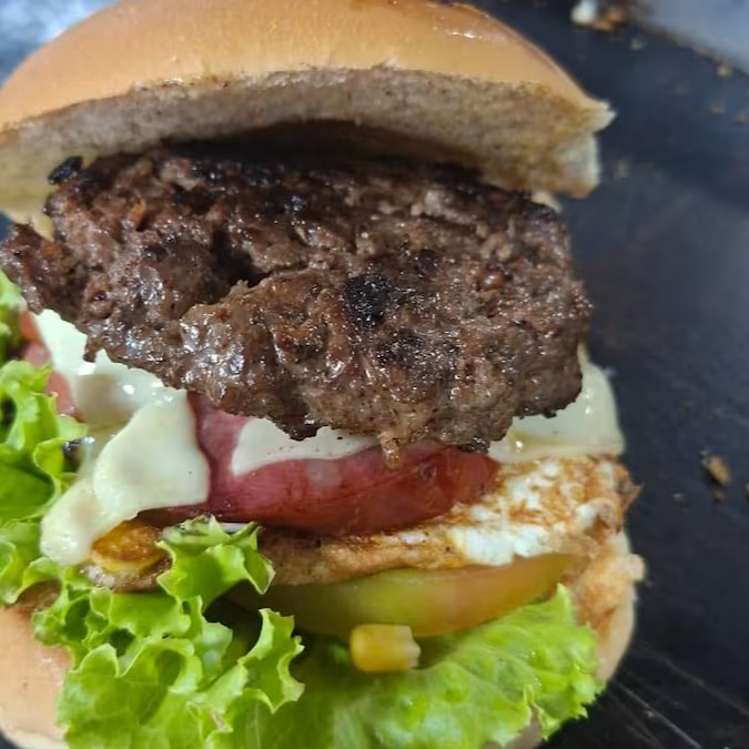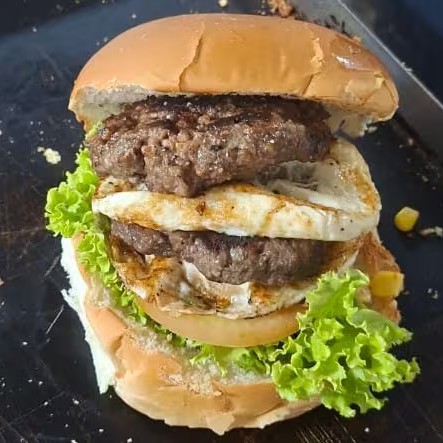 Pão bola, 2 carnes, 2 ovos, alface, tomate, milho, batata palha.