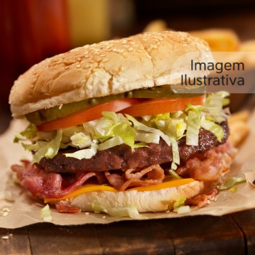 Pão bola, carne, bacon, ovo, queijo, tomate, alface, milho, batata palha.