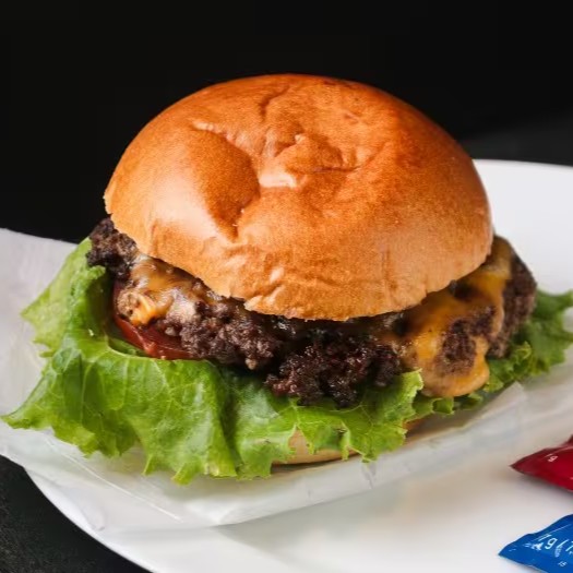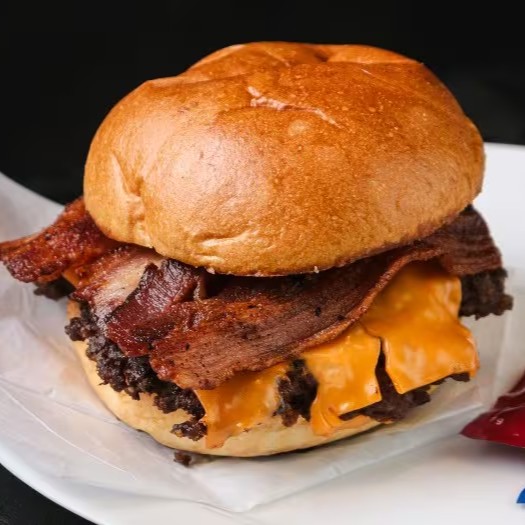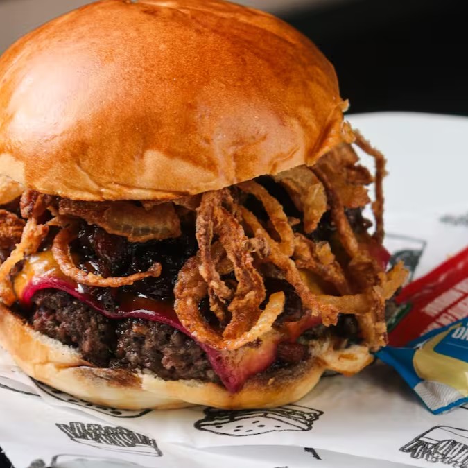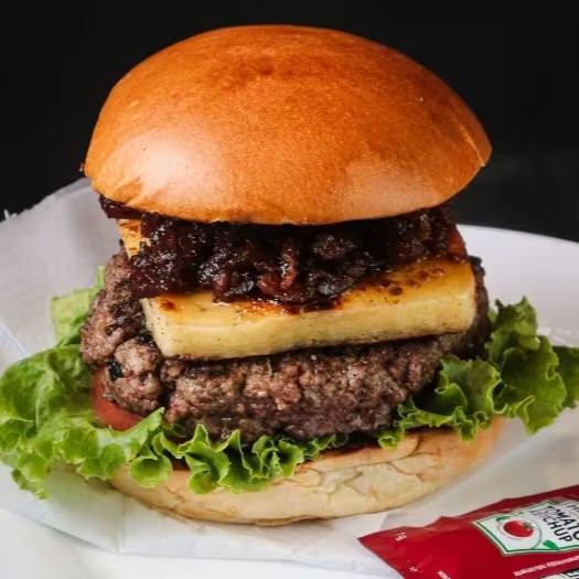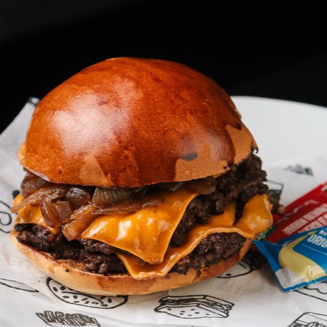 Pão, duas carnes amassadas (80g), duplo queijo cheddar & cebola caramelizada.