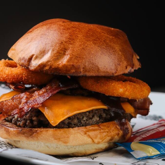 Pão, Blend (160g), queijo cheddar, onion rings, bacon fatiado & barbecue.