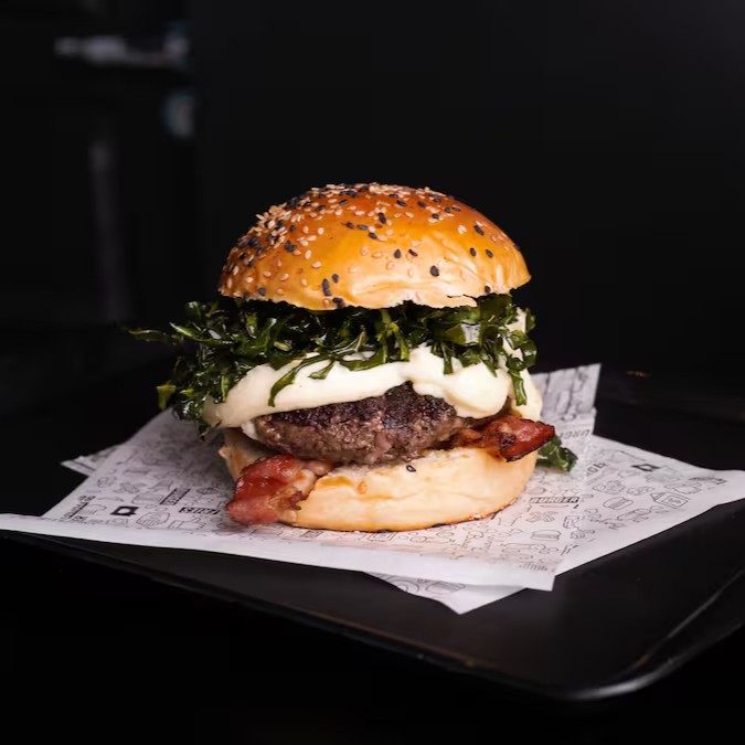 Pão com gergelim, blend (160g), couve crispy, barbecue, alho frito, bacon & Catupiry (Original).