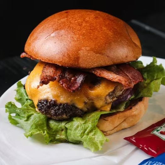 Pão, blend (160g), salada (alface, tomate e cebola roxa), bacon & queijo prato.