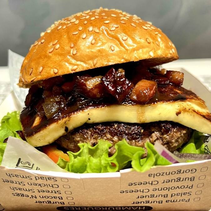 Pão, blend (160g), queijo coalho chapeado, bacon caramelizado & salada (alface, tomate e cebola roxa).