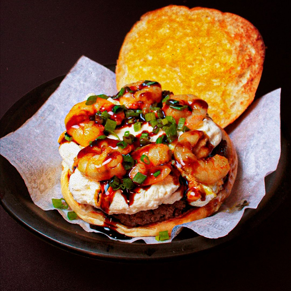 Pão, carne Smash (80g), cream cheese, molho tarê e cebolinha.