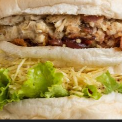 Pão , frango, bacon, queijo,presunto,salada batata palha.