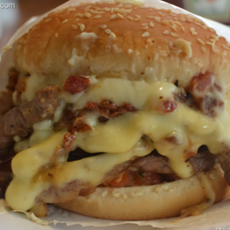 Pão careca, Filé, Bacon, Queijo, Presunto e Batata Palha.