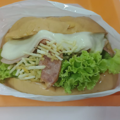 Pão bola, carne caseira, queijo, presunto, calabresa, bacon, salsicha, ovo, salada e batata palha