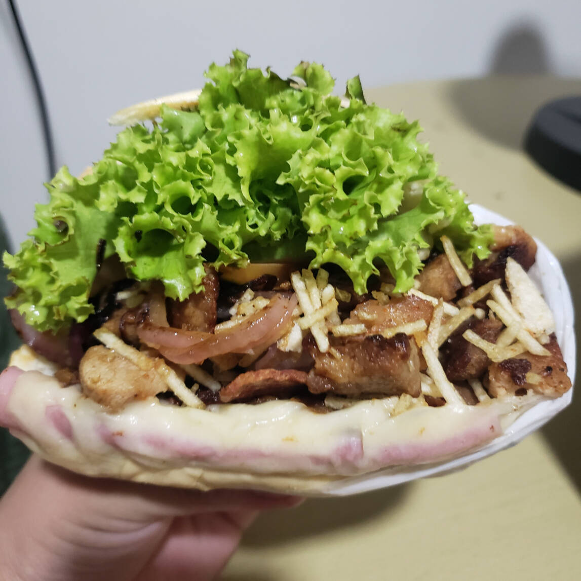 Pão careca, picanha, bacon, queijo, presunto, ovo, calabresa, salsicha, salada e batata palha.