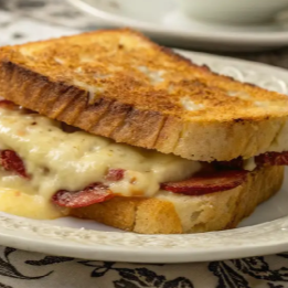 Pão de forma dourado na chapa, queijo, presunto e calabresa.