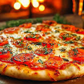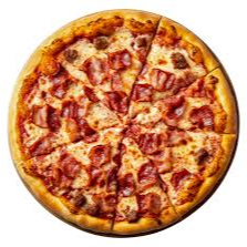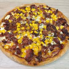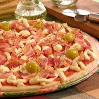 Molho de tomate, muçarela, calabresa, frango, bacon, ervilha, milho, azeitona e orégano