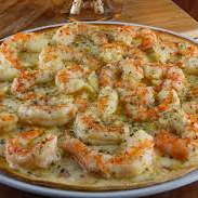 Molho de tomate, muçarela, camarão rosa, azeitona e orégano