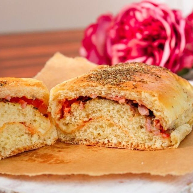 Pão artesanal, recheado com queijo mussarela e presunto, finalizado com orégano.