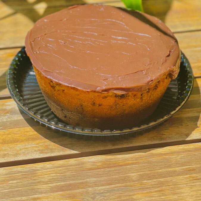 Bolo de massa amanteigada com granulado de chocolate, finalizado com cobertura de chocolate. (Aproximadamente 15cm)