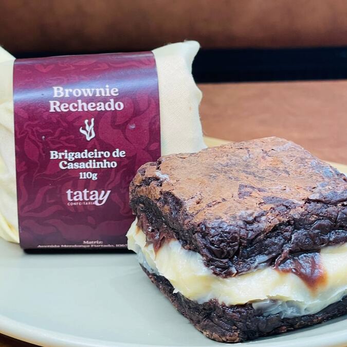 Brownie de chocolate recheado com brigadeiro de chocolate 50% cacau e brigadeiro de leite Ninho. É embalado delicadamente em tecido de cetim.