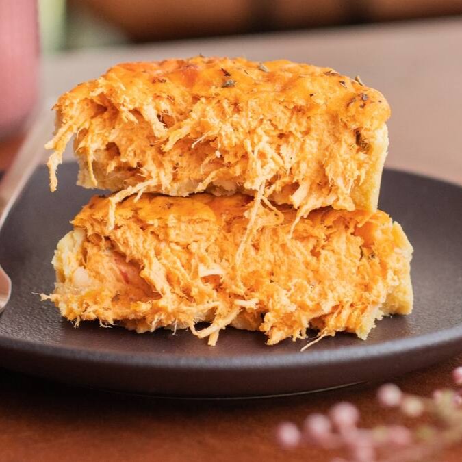 Frango desfiado, molho artesanal cresmoso, finalizada com queijo mussarela.