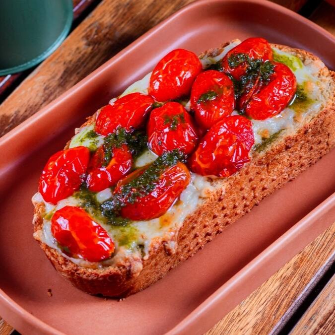 Tomate confit, queijo muzarela de búfala e pesto de manjericão.