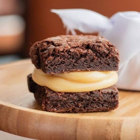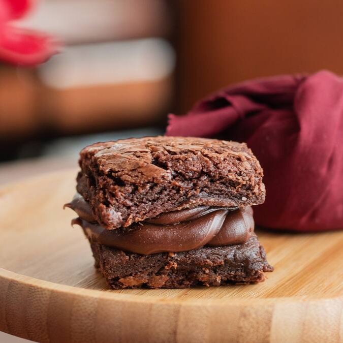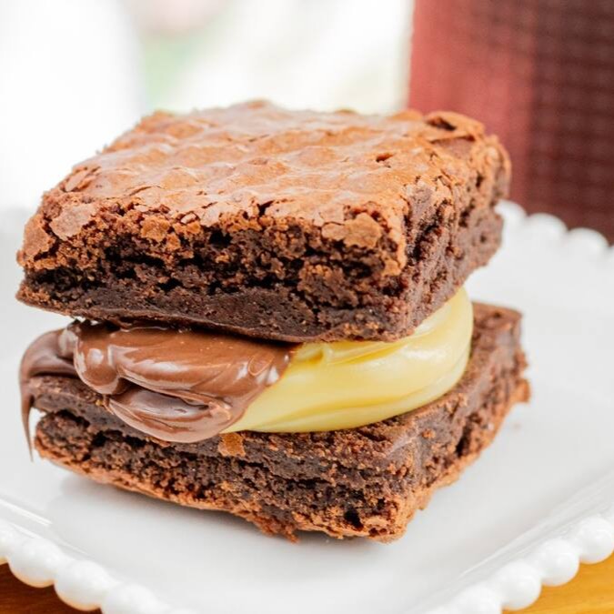 O queridinho! Quadradinho de brownie recheado de brigadeiro cremoso de leite Ninho intercalado com Nutella pura, envolvido em um tecido lido para finalização.