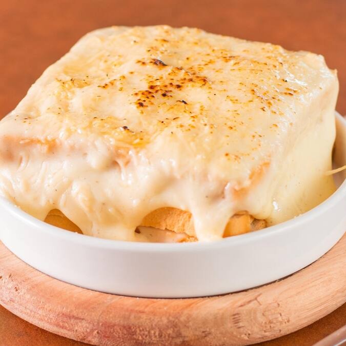 Sanduíche francês clássico, preparado com pão de forma dourado, presunto, queijo e molho bechamel cremoso, gratinado no forno.