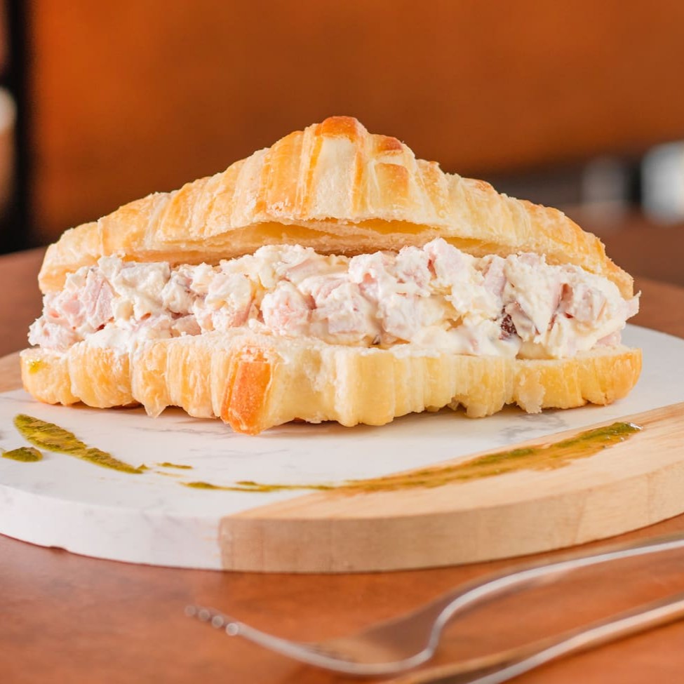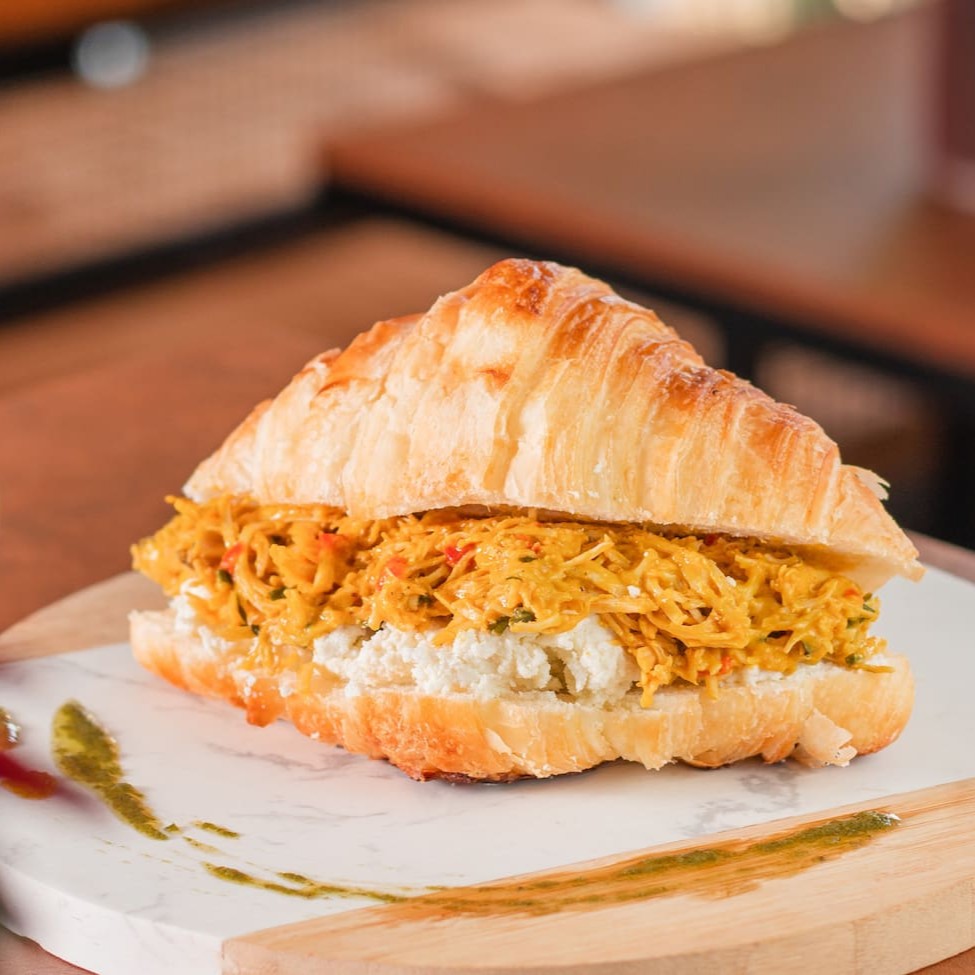 Desfrute do nosso Croissant de Frango com Emulsão de Mostarda. Este prato magnífico apresenta um frango suculentamente desfiado, preparado até atingir uma textura cremosa e irresistível. Essa maravilha é realçada com uma sofisticada emulsão de mostarda, oferecendo um sabor característico e marcante. Para aprimorar ainda mais a sua experiência gastronômica, este croissant é servido com um delicioso pesto de manjericão, que acrescenta um toque de frescor e autenticidade. Prepare-se para uma refeição de sabor inesquecível com nossos croissants salgados.