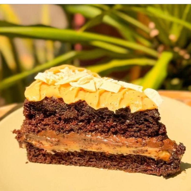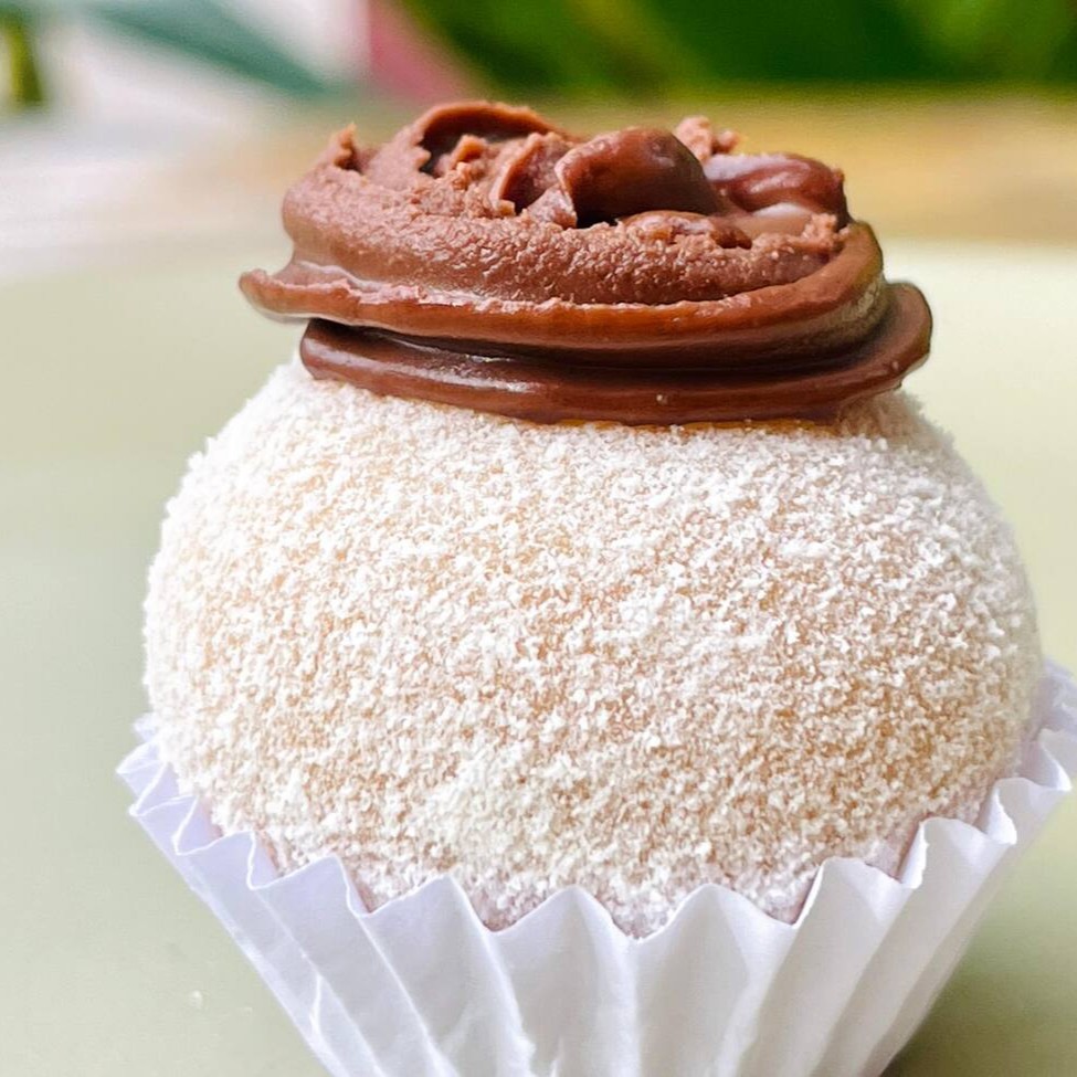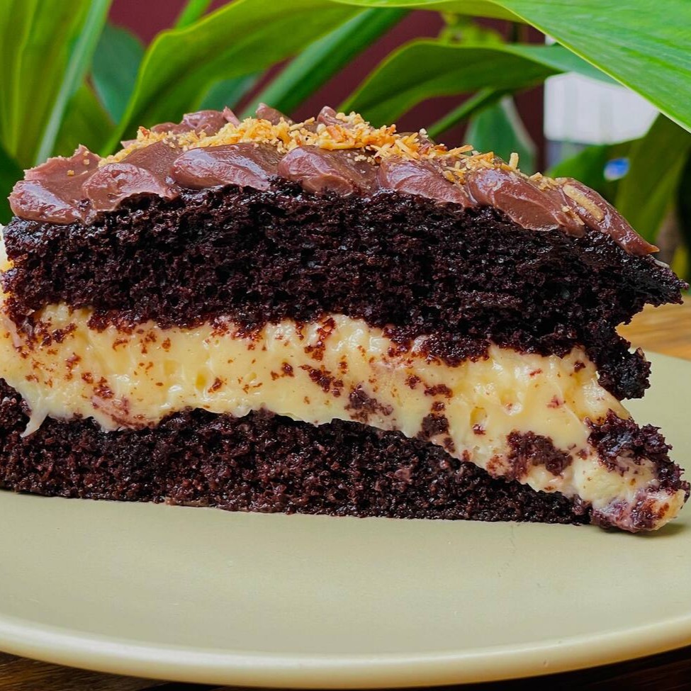 Uma verdadeira tentação a massa de chocolate meio amargo combina perfeitamente com o recheio de brigadeiro artesanal cremoso de coco, finalizado com chocolate ao leite e raspa de coco torrado.