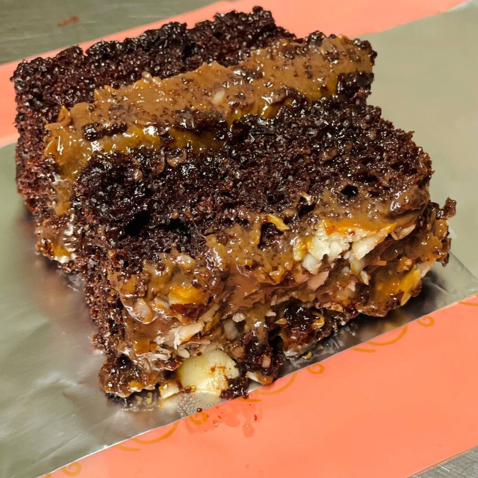 Massa de chocolate levemente úmida recheado com bastante brigadeiro de chocolate e geleia de cupuaço, finalizado com brigadeiro de chocolate e pedaços de castanha do pará.