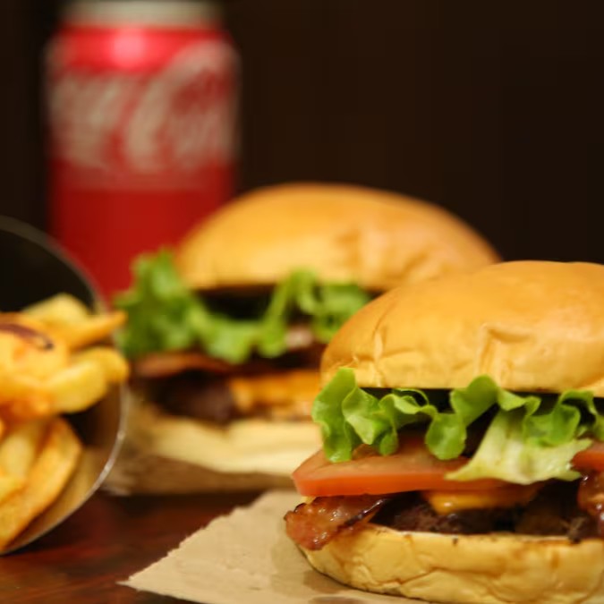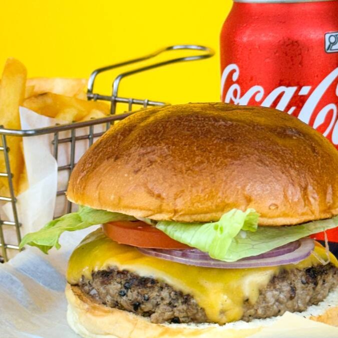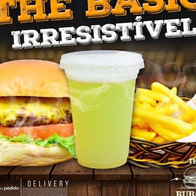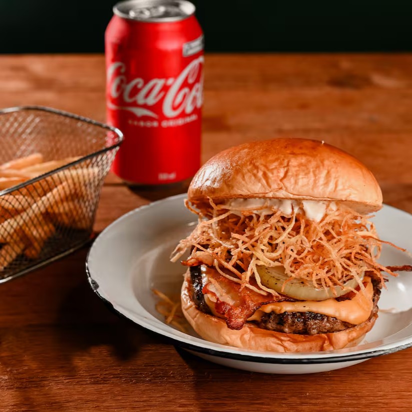 Burger bovino de 150g, queijo American cheese, cebola grelhada, bacon em fatias, batata palha da casa e molho de alho assado. 100g de batata e uma coca-lata