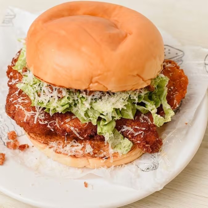 Sobrecoxa empanado,molho caesar,alface,bacon crispy,parmesão salado