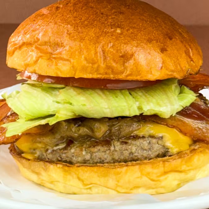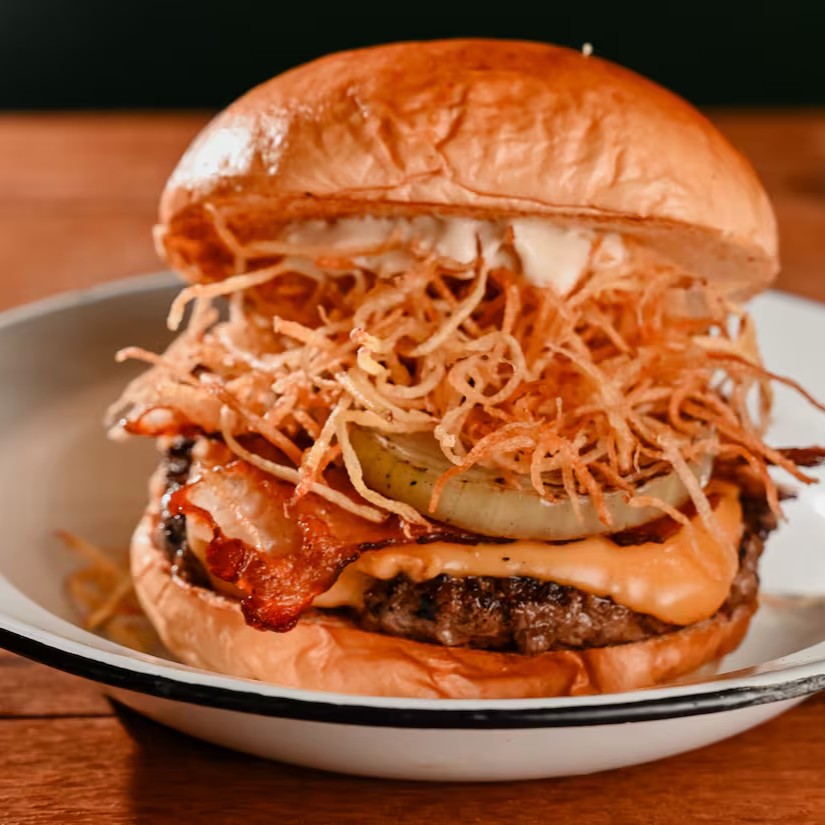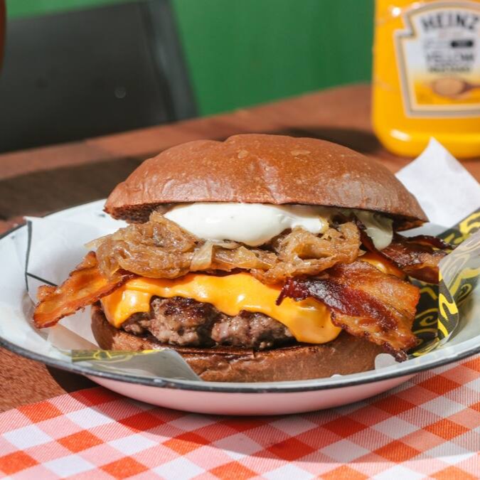 Burger bovino de 150g, queijo American cheese, cebola grelhada, bacon em fatias, batata palha da casa e molho de alho assado
