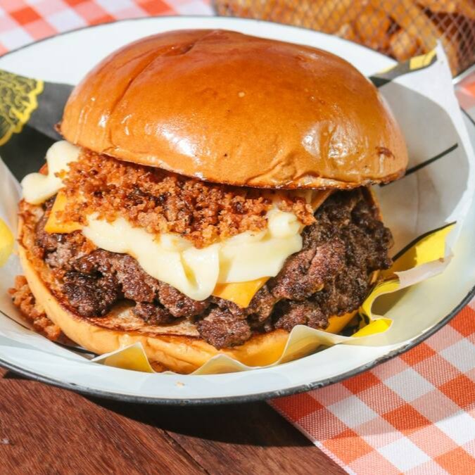2 smash de 75g, queijo, Catupiry Original, farofa de bacon e maionese da casa