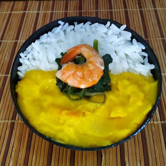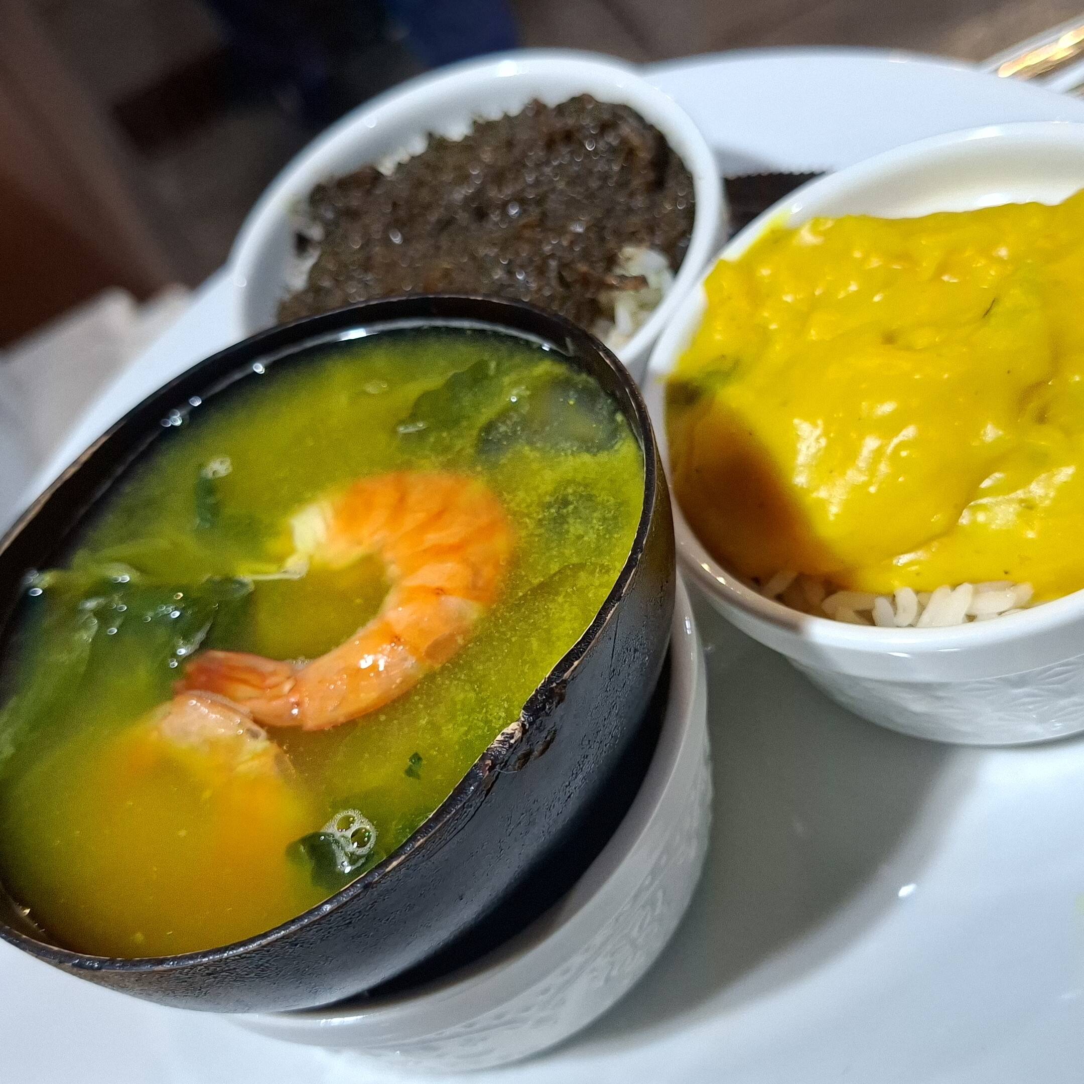 Caruru tradicional com quiabo, camarão seco, amendoim e dendê, acompanhado de arroz branco.