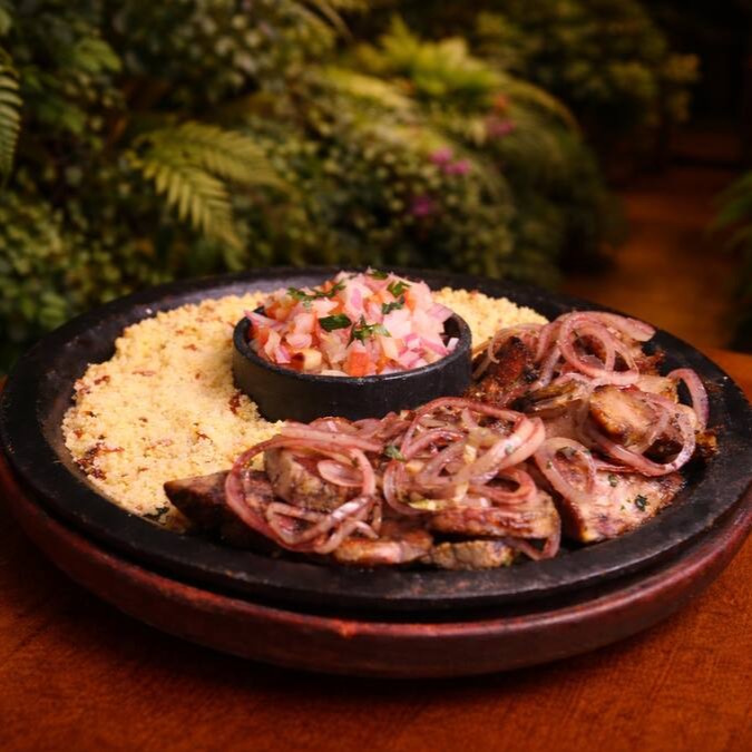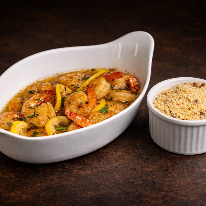 Seleção de 15 camarões Gg, marinados em vinho branco, alho fresco e especiarias da casa. Flambados à moda francesa, resultando em um preparo sofisticado e aromático, com textura suculenta e sabor marcante. Acompanhados de farofa artesanal crocante, que equilibra e realça cada elemento do prato.