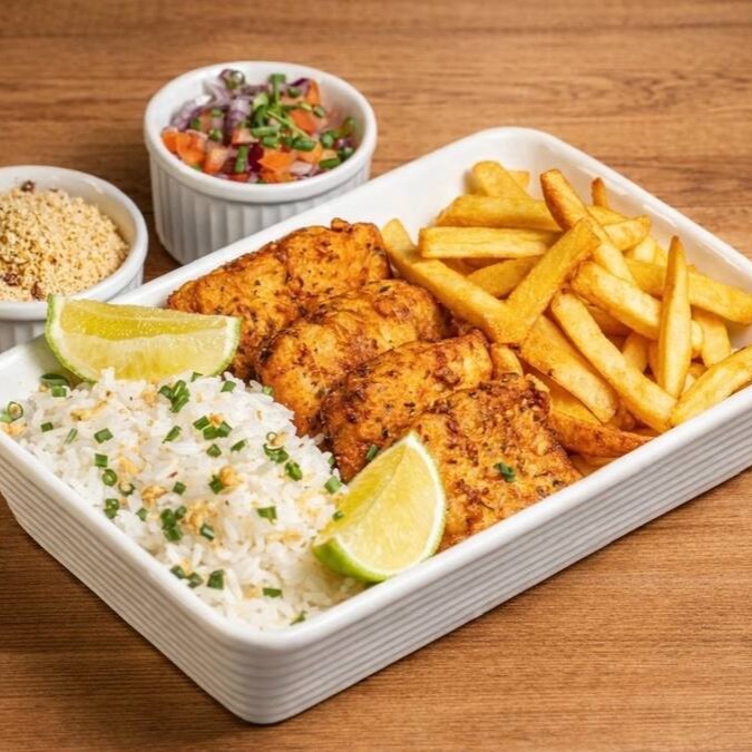 Pescada frita, arroz branco, batata fritas, farofa de mandioca com calabresa, vinagrete.