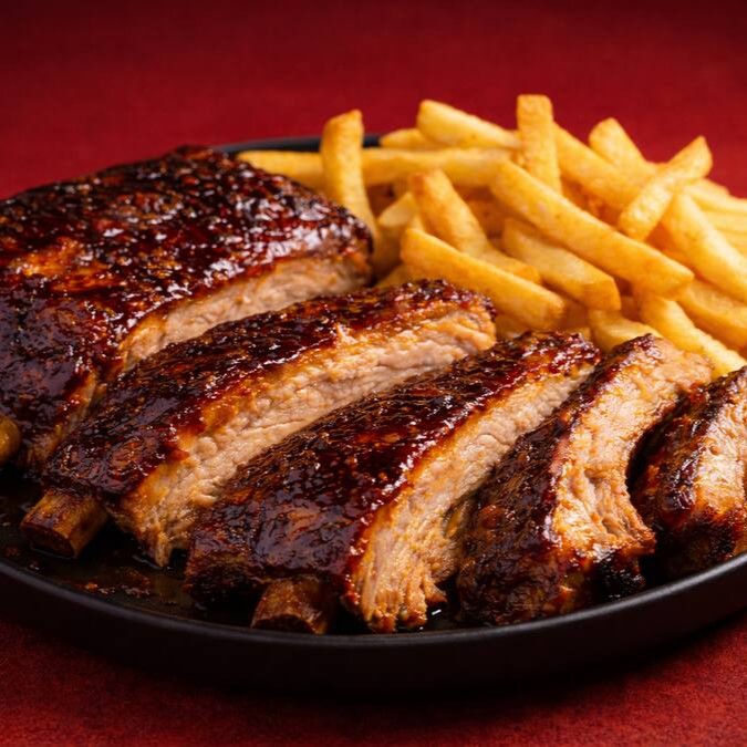 Costela de suína selecionada, lentamente defumada por 20 horas em especiarias, resultando em uma carne extremamente macia e suculenta. Finalizada com nosso exclusivo barbecue artesanal, levemente caramelizado, que realça notas adocicadas e defumadas. Acompanha batatas fritas crocantes e douradas.